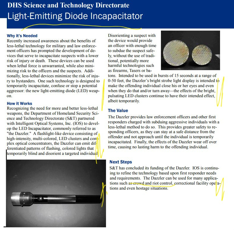 This light emits high intensity, multi-colored, LED clusters, differentiated patterns of flashing light, bright strobe light that temporarily blind, disorient, incapacitate people.